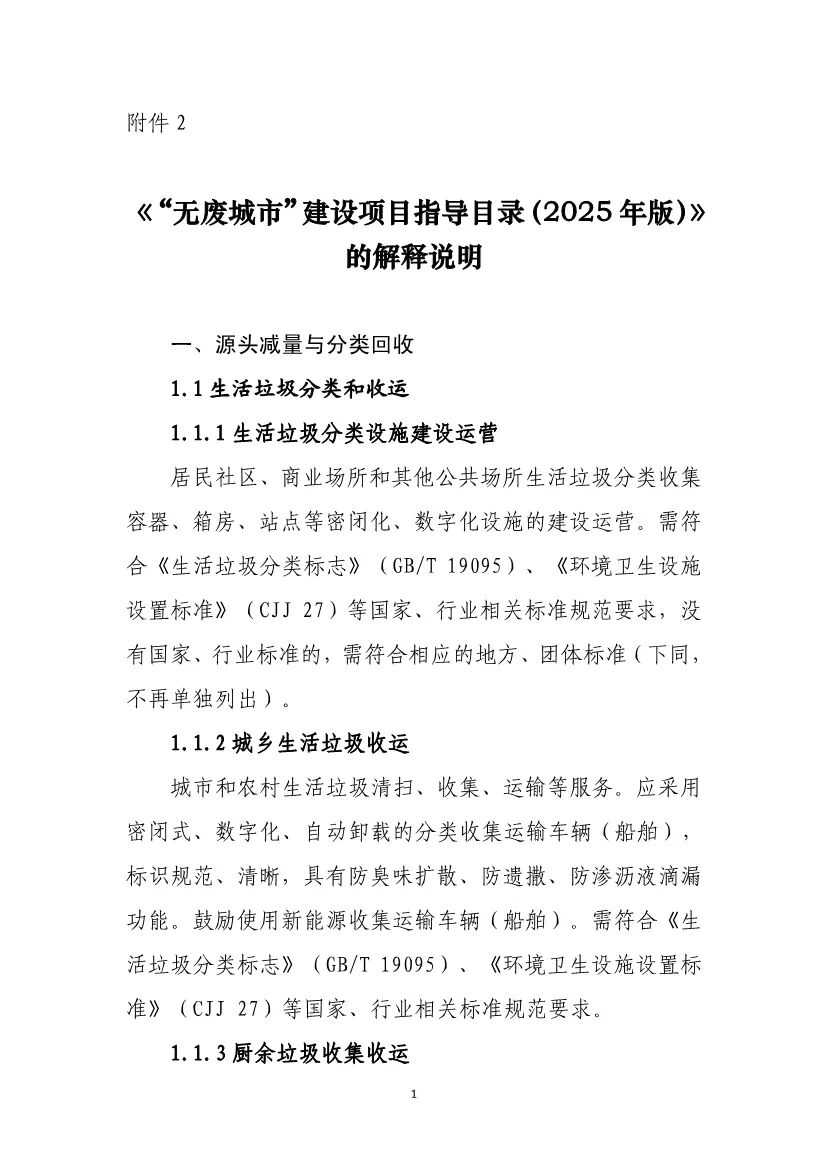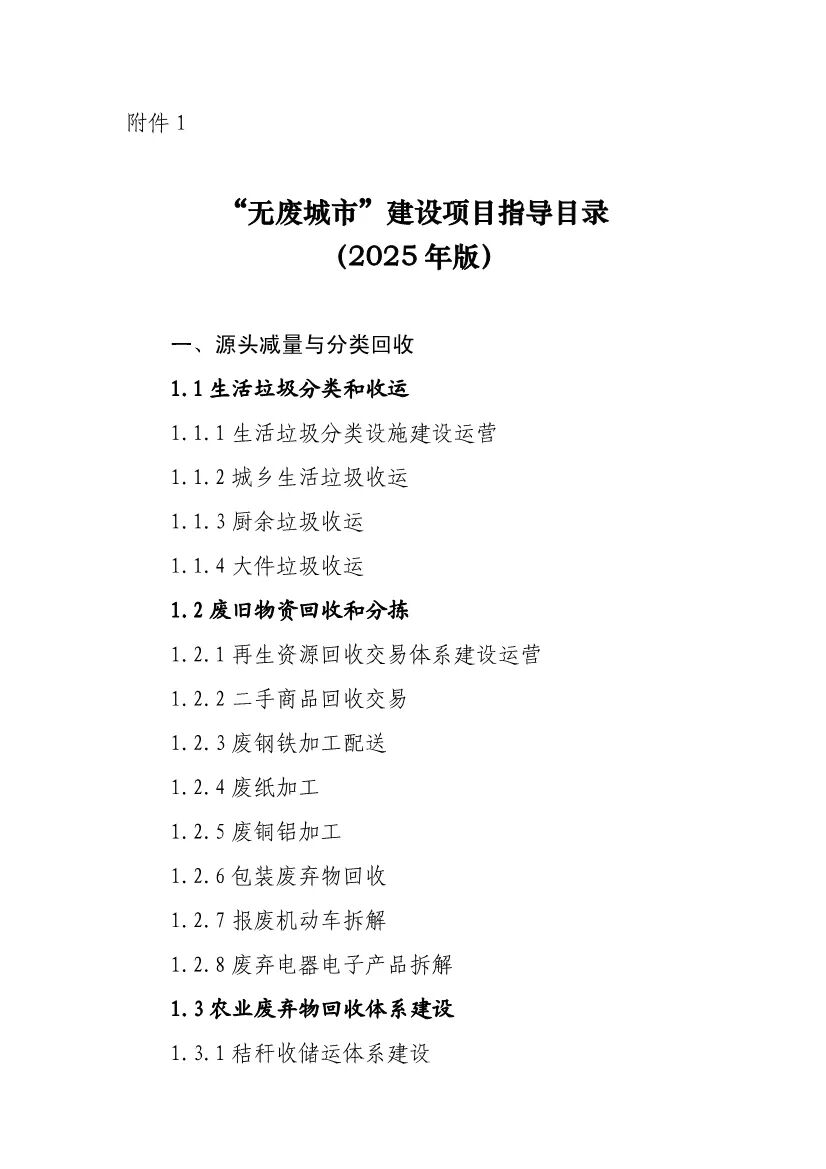 为深入推进无废城市建设,加快构建和完善无废城市建设市场体系,培育壮大新质生产力,生态环境部固体废物与化学品管理技术中心、生态环境部环境规划院、北京绿色交易所有限公司、北京银行股份有限公司、中环联合(北京)认证中心有限公司编制了《无废城市建设项目指导目录(2025年版)》(以下简称《目录》)。 现予公开,供社会各界参考使用。