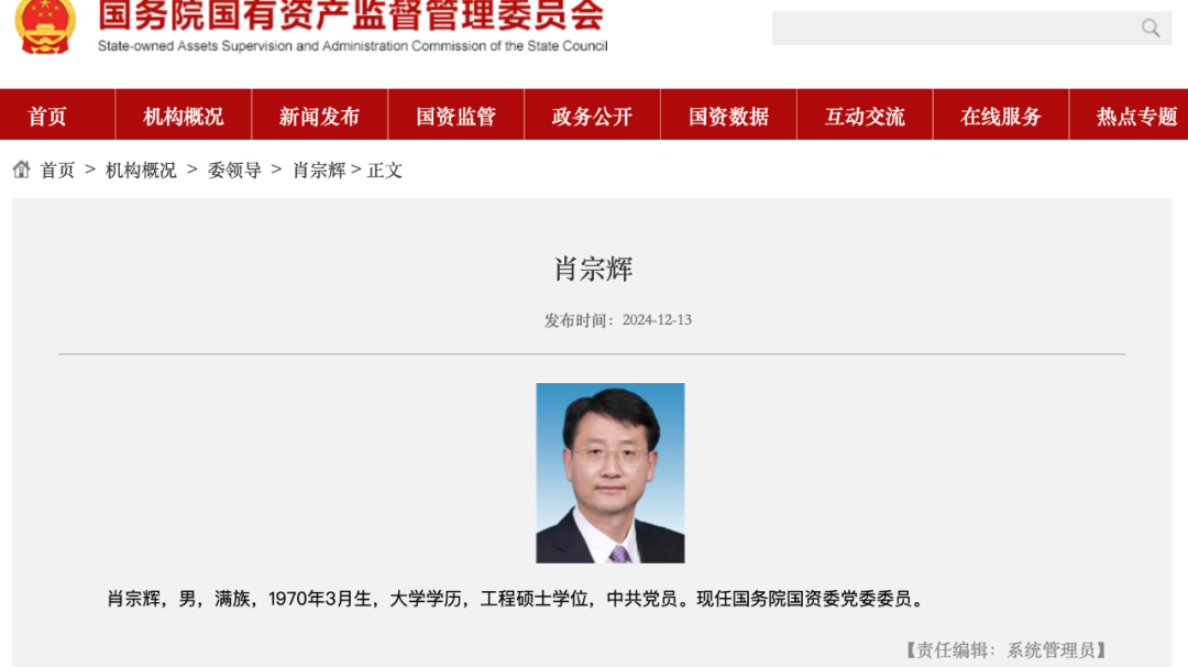 国务院国资委网站机构概况栏目近日更新显示, 肖宗辉已任国务院国资委党委委员。