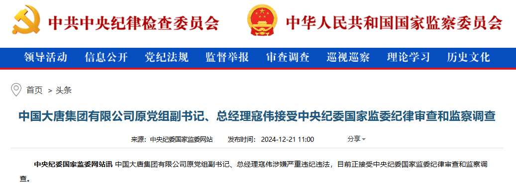 据中央纪委国家监委12月21日消息,中国大唐集团有限公司原党组副书记、总经理寇伟涉嫌严重违纪违法,目前正接受中央纪委国家监委纪律审查和监察调查。