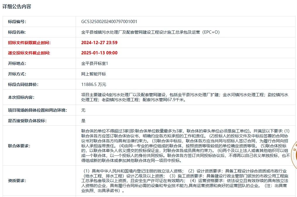 12月20日,云南金平县城镇污水处理厂及配套管网建设工程设计施工总承包及运营(EPC+O)招标公告发布。
